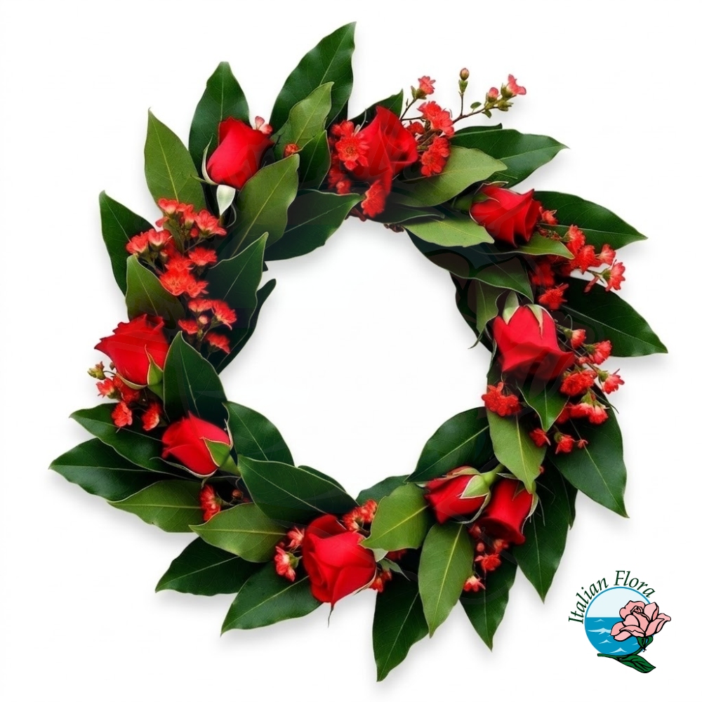 Corona di Alloro Classica con Rose Rosse e fiori rossi :