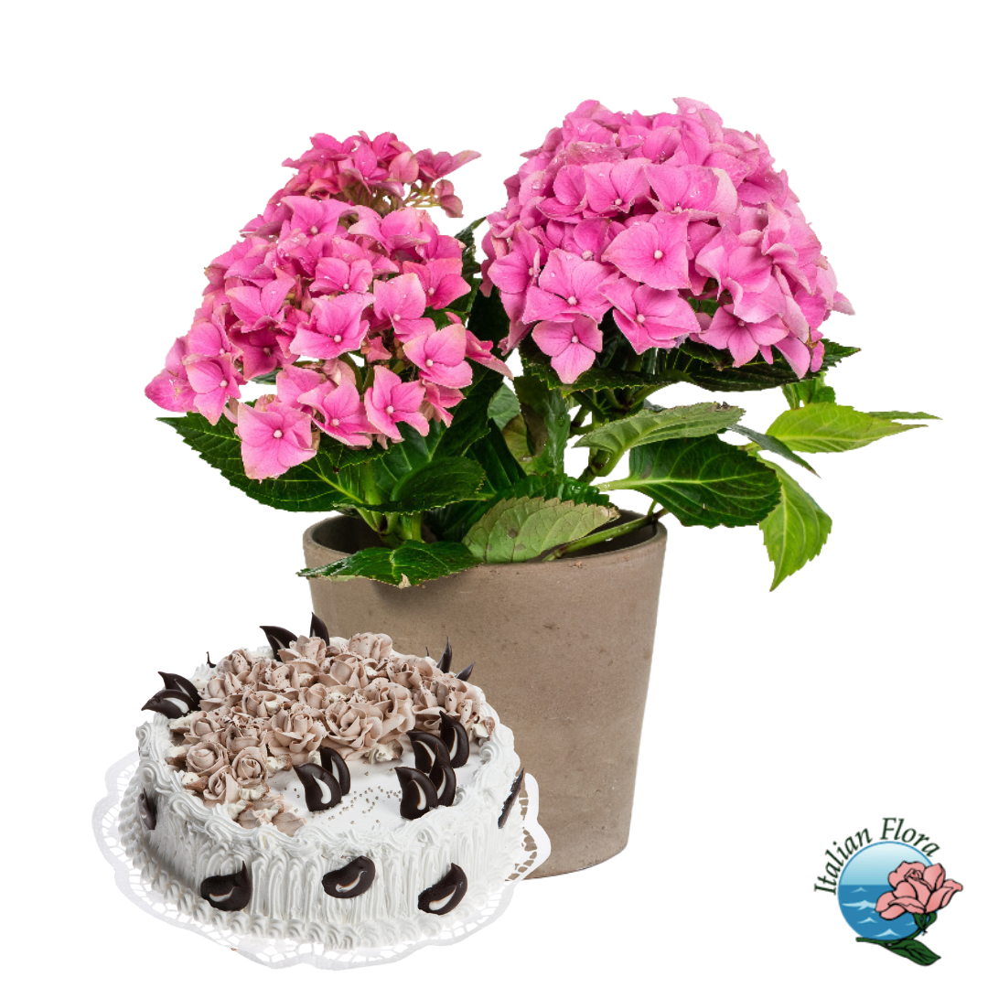 Regala un’esplosione di colore e dolcezza con questa combinazione che unisce il fascino intramontabile dell’ortensia, con le sue generose infiorescenze a palla, alla golosità irresistibile di una torta alla panna appena sfornata.